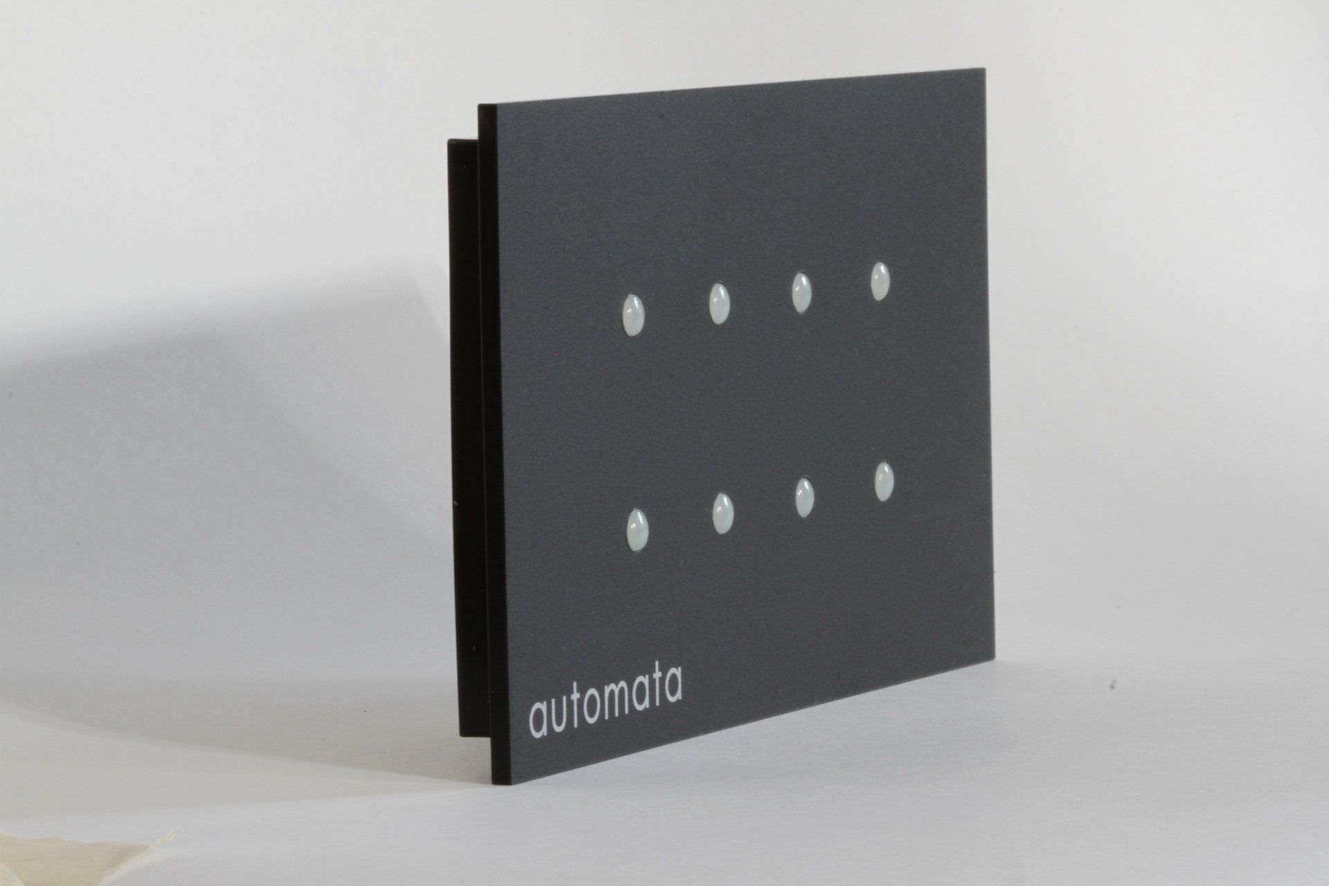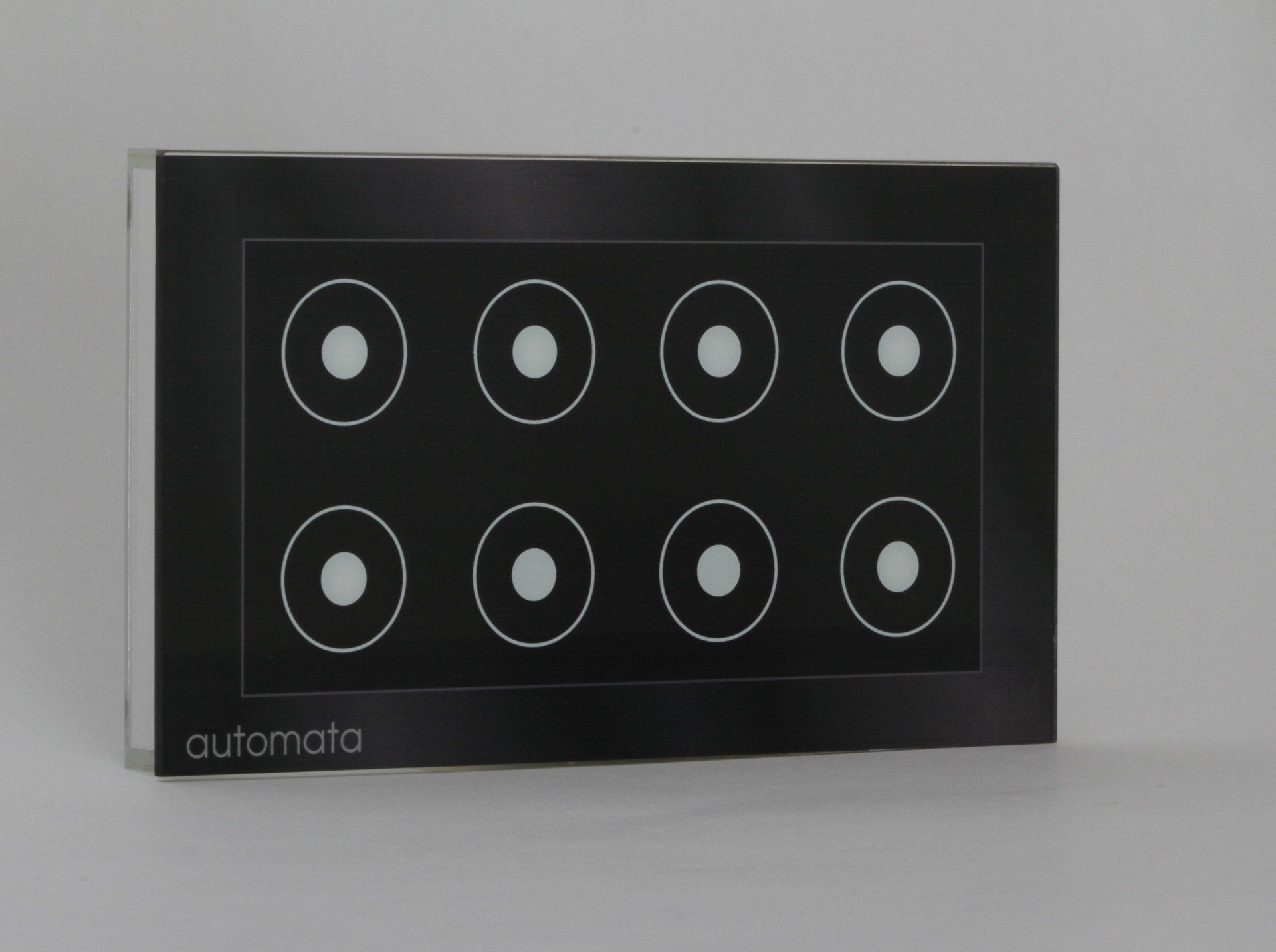 A panel unit of 8 smart switches with an LED light to indicate operation, to activate lighting fixtures/ scenarios, etc